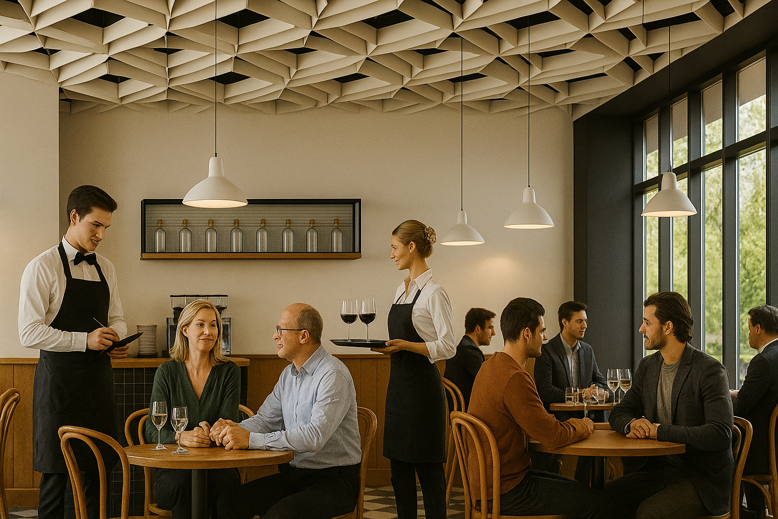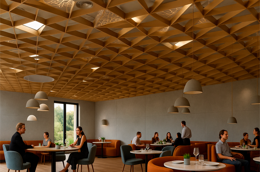 Не менее важно влияние потолка на акустику. В помещениях, где звучит фоновая музыка или живые выступления, материал и конструкция потолка определяют уровень комфорта. Слишком жёсткая поверхность отражает звуки и создаёт эхо, тогда как потолки с перфорацией или акустическими панелями поглощают шум, делая речь разборчивой, а атмосферу — спокойной и гармоничной.